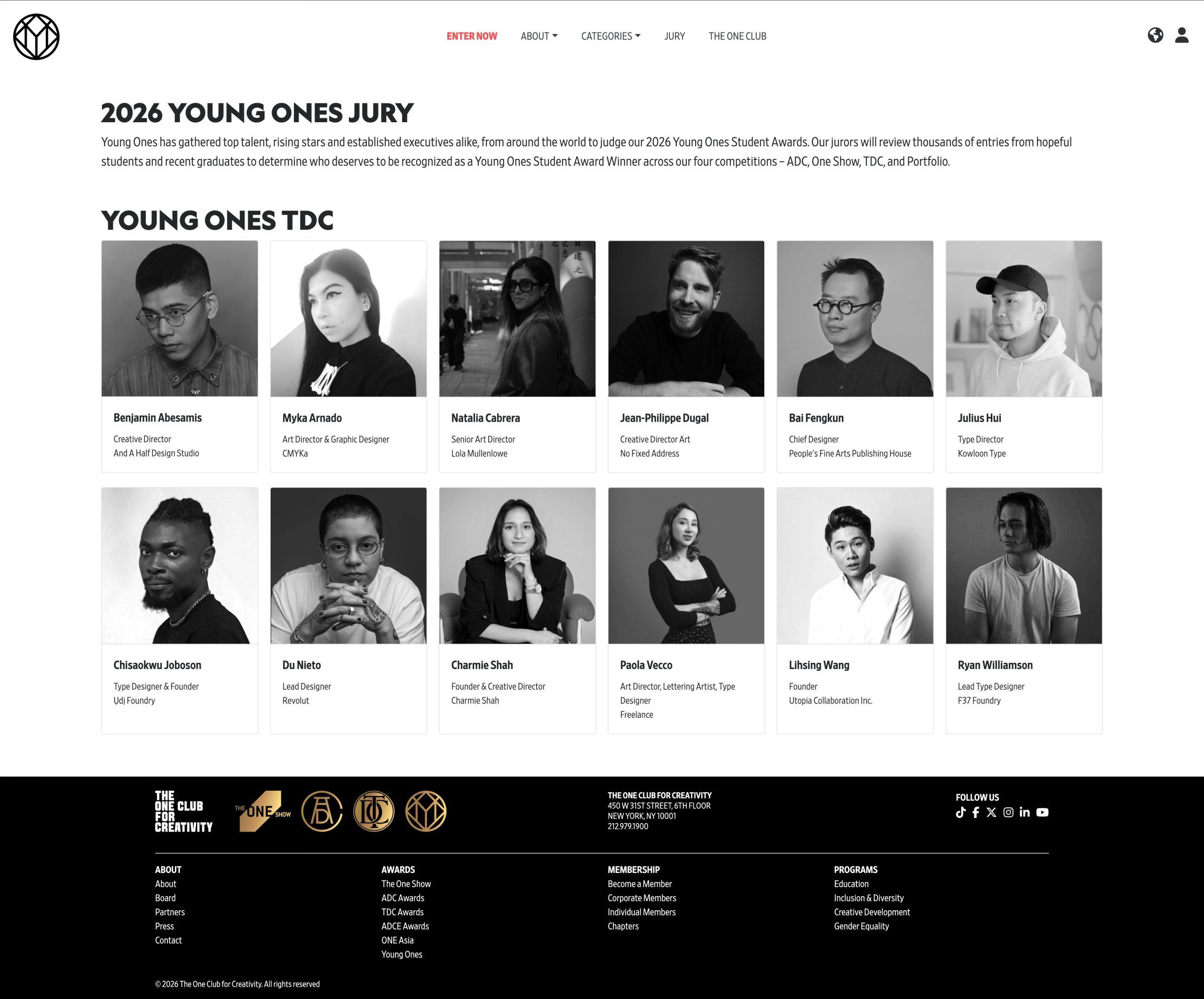 白凤鹍荣幸受邀,成为 Young Ones TDC 2026 评委会成员。2026 年 The One Club for Creativity 全面整合了学生组奖项,形成 YOUNG ONES ADC、YOUNG ONES ONE SHOW、YOUNG ONES PORTFOLIO、YOUNG ONES TDC、CLIENT PITCH 多个类别的赛事。
